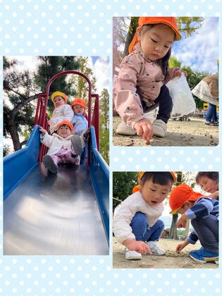 予定していた遠足の日はお天気が悪く残念でしたが、予備日は秋らしいとても過ごしやすい日になりました。 子どもたちは、いつも以上に元気に登園し、遠足、遠足とワクワク ♪ 歩きたいお友だちと、避難車に乗るお友だちと元気よく出発! 途中で道路沿いのお家のお花を見せていただいたり、みんなで歌をうたいながら行きま...