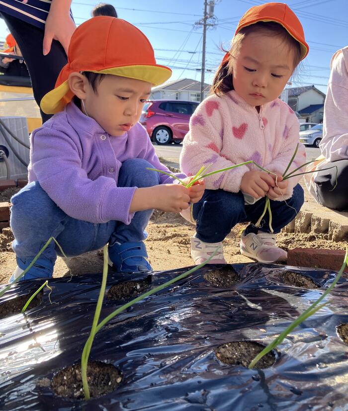 2025. 11 .26 玉ねぎを植えました! 2025年11月26日(水) この日はみんなで、玉ねぎの苗を植えました。 子どもたちも「玉ねぎのあかちゃん♡」と、大事そうにがんばって植えてくれました。 玉ねぎが大きく育って、またみんなで食べるのが今から楽しみです!