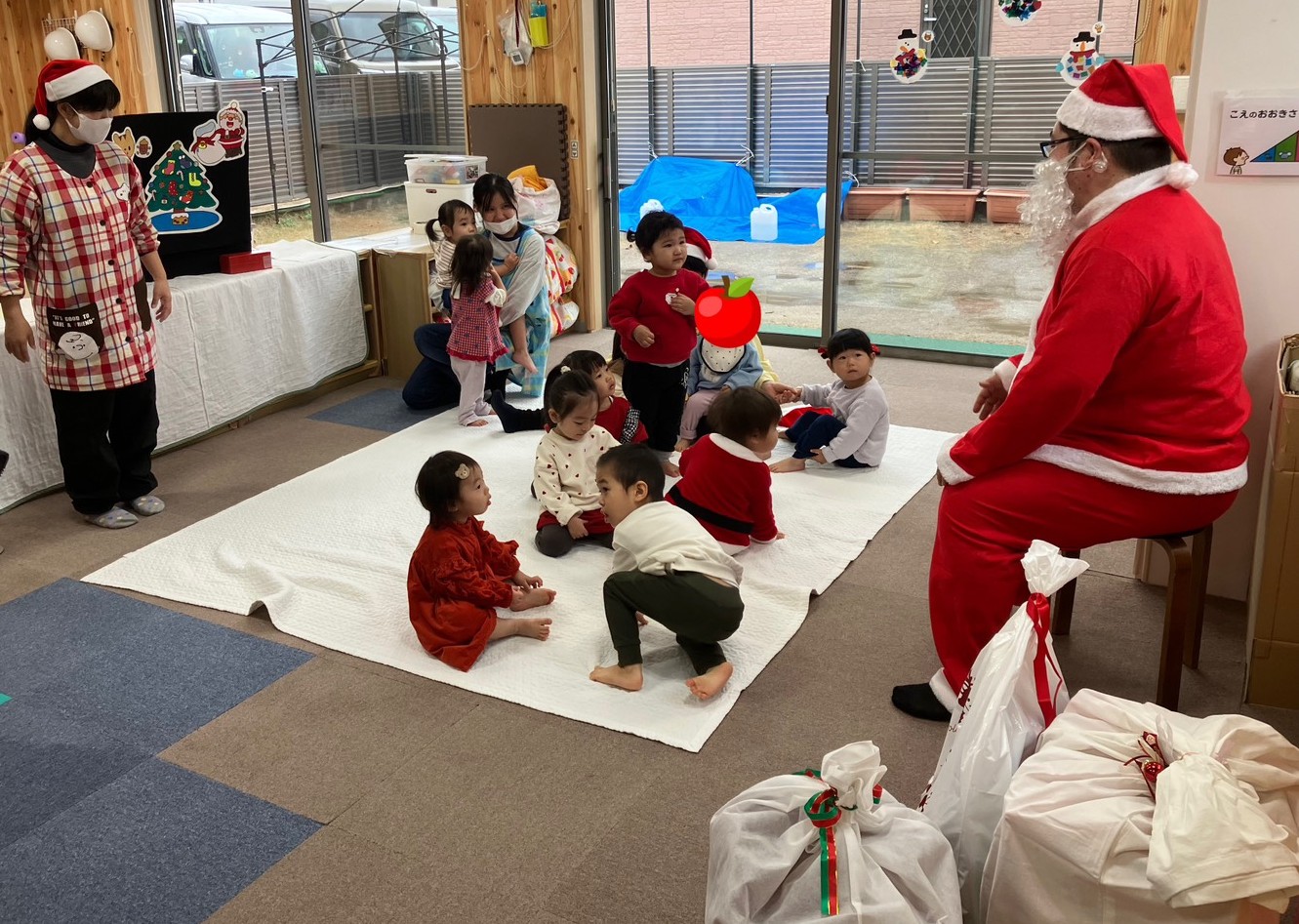 2025. 12 .24 サンタさんが来てくれたよ ♬ 2025年12月24日(水) なちゅっこにもサンタクロースがやってきました。 子どもたちは大興奮! サンタさんのパネルシアターを見たり、プレゼントをもらったり、 子どもたちからはサンタさんにお礼の鈴の音楽のプレゼントをしました。 それから、サンタさんに質問をしたりして、とても楽しいひとときとなりました。 早速、サンタさんからのプレゼントで遊び、大喜びの子どもたちでした ♪
