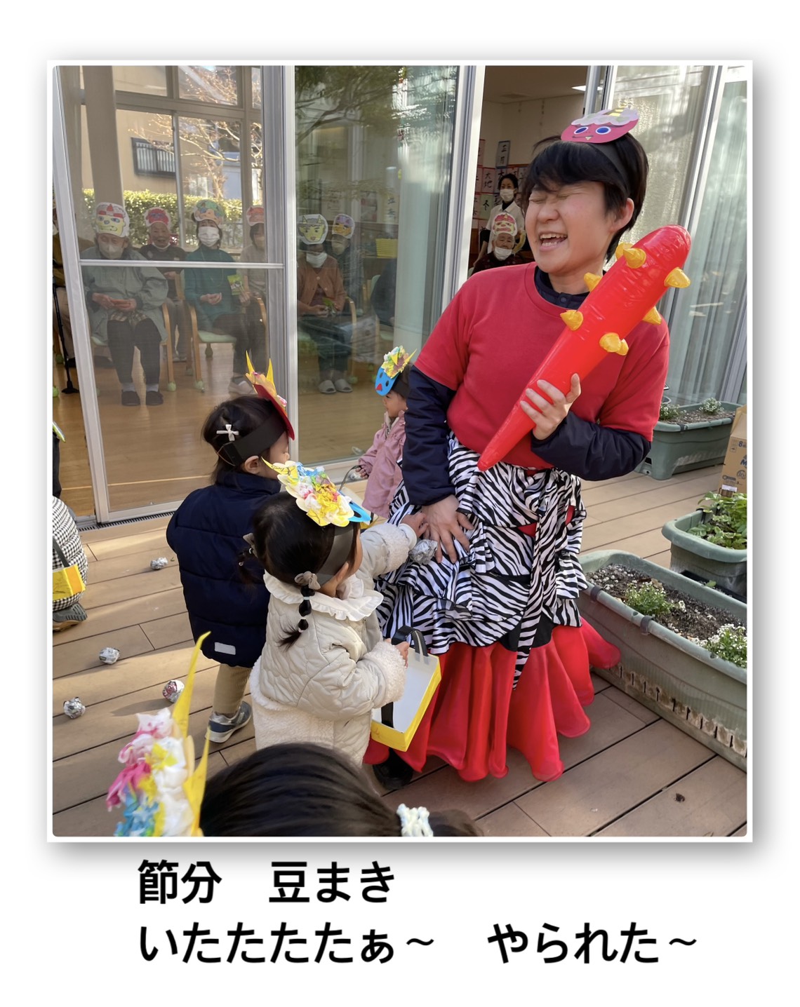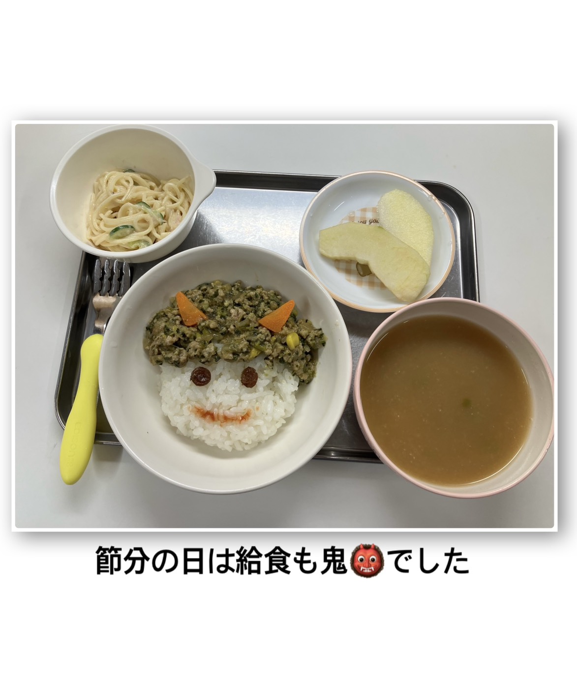 2026. 2 .3 豆まき! 2026年02月03日(火) 今日は節分。子どもたちはデイサービスのおじいちゃん・おばあちゃんたちと一緒に豆まきをしました。 はじめのうちは鬼の登場に戸惑っていた子どもたちも、徐々に慣れて、鬼に新聞紙豆を投げれるようになりました ♪ 給食に登場した鬼も、モリモリ食べてやっつけました!