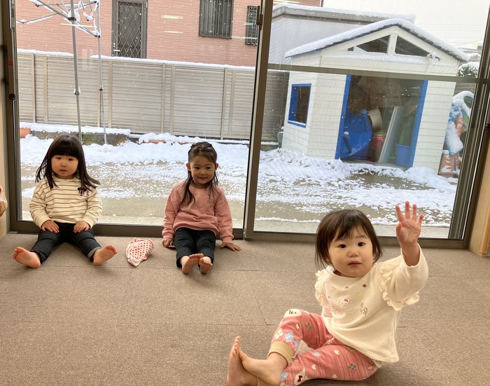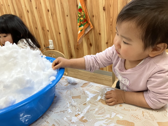 2024.1.25 雪だー!!! 2024年01月25日(木) 雪がたくさん積もりました。 なかなか見ることのない雪に、子どもたちは大興奮!! この日はお部屋に雪を持ってきて、みんなで触って遊びました。 「ふわふわ~♪」「冷たーい!」と感触を楽しんだり、 雪が少し怖い子は、おそるおそる指先で触ったり。 さまざまな姿が見られました。 でも最後は手が冷たくて、温めるためのお湯が一番気持ちよさそうな 子どもたちでした! また降るといいねー♪