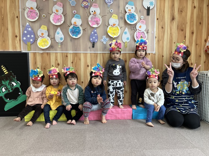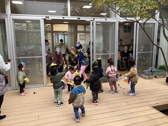 2024.2.2 まめまき 2024年02月02日(金) デイサービスのおじいさん、おばあさんと一緒に豆まき交流会をしました。 日頃から踊っていた「鬼のパンツ」を披露して、いざ鬼が出現!! となっても、室内でたくさん豆まきごっこをしていたからか みんな楽しそうに豆を投げ、鬼を退治する子ども達でした(≧▽≦) 手作りの鬼のお面もみんなお気に入りで、お部屋遊び中でもたくさんかぶっていました。 みんなでハイポーズ!! パチリ!!
