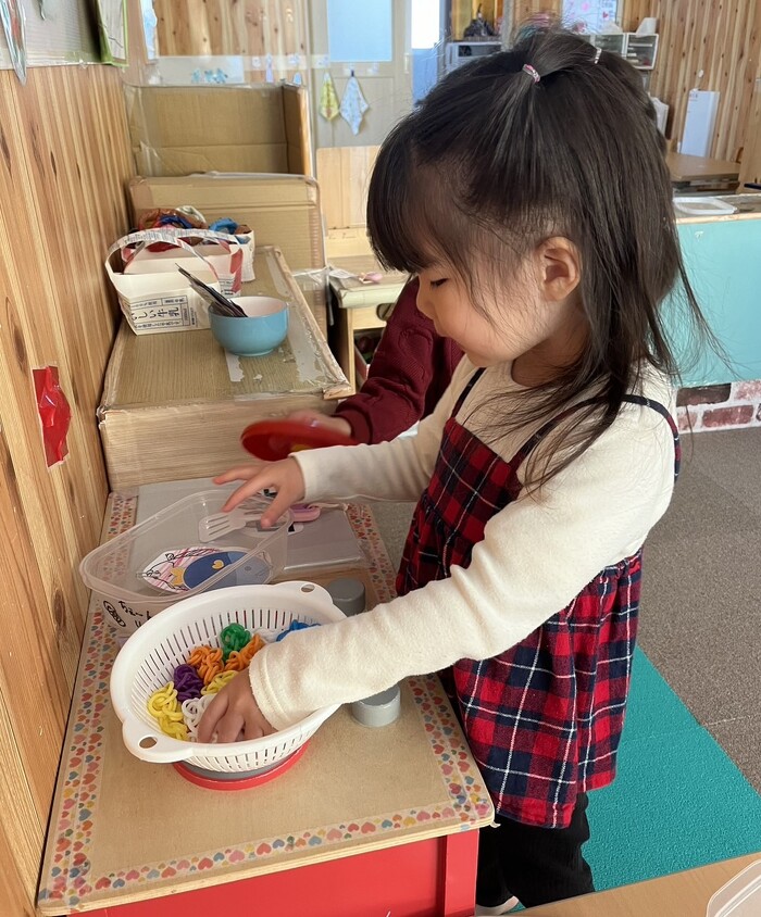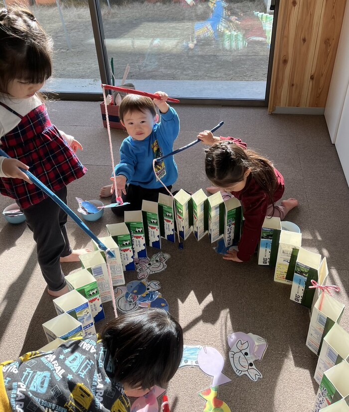 2024.2.8 釣れたよー! 2024年02月08日(木) 「やったー!釣れたよー!!」「僕も釣れたよー!」 今日はお魚釣りを楽しんでいます。 お魚の口に釣り竿の糸の先を合わせるのはちょっぴり難しいけれど集中、集中… コツをつかんだら、みんな大漁でした\(^o^)/ さっそく釣れたお魚でおままごと。どんなご飯ができるかなー??