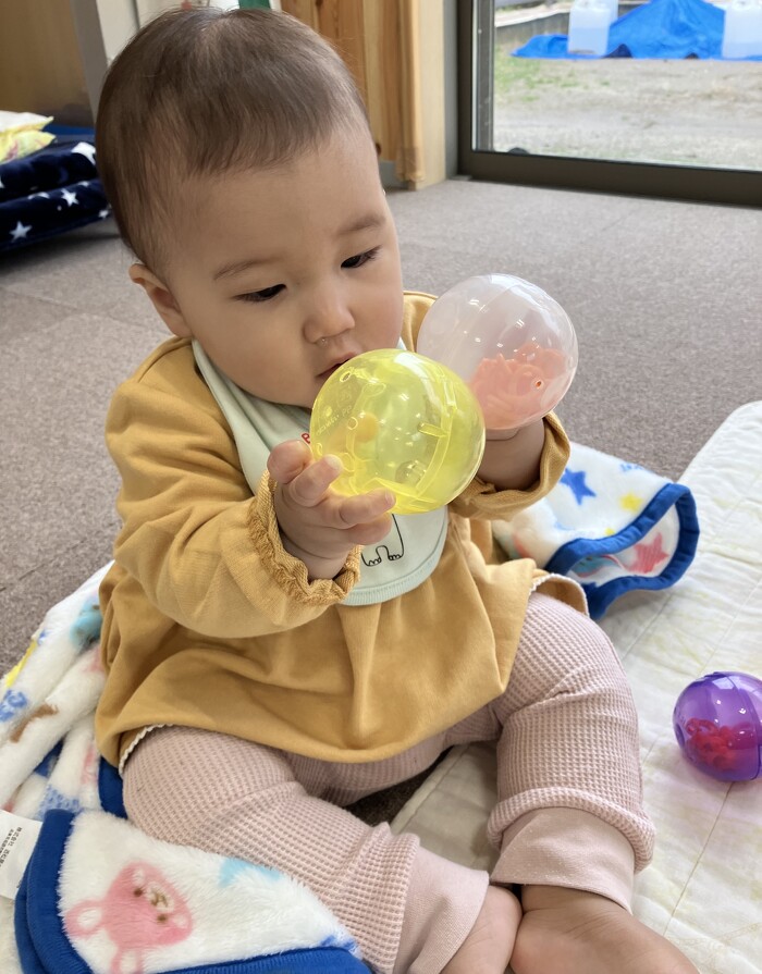2024.4 .15 いろいろ探索中です 2024年04月15日(月) 0歳児のお友だちも少しずつ慣れてきて、笑顔がいっぱい見られるようになってきました。 楽しいおもちゃはないかな?どんな風景が見えるかな?たくさん探索中です(^_^)