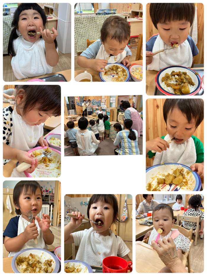 2024.6 .21 楽しみにしていたカレーパーティー!! 2024年06月21日(金) カレーパーティーに向けて、歌をうたったり、絵本やパネルシアターを見て 楽しみにしてきました ♪ 当日は畑で取った玉ねぎをみんなで皮をむいたり、買い物で買った野菜を使って、 調理員さんが作ってくれるところを見たりもしました。 出来上がってみんなで食べるカレーライスはとってもおいしかったです!