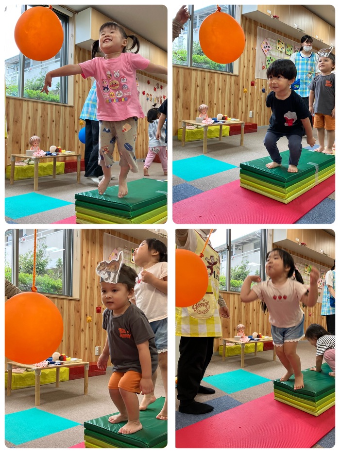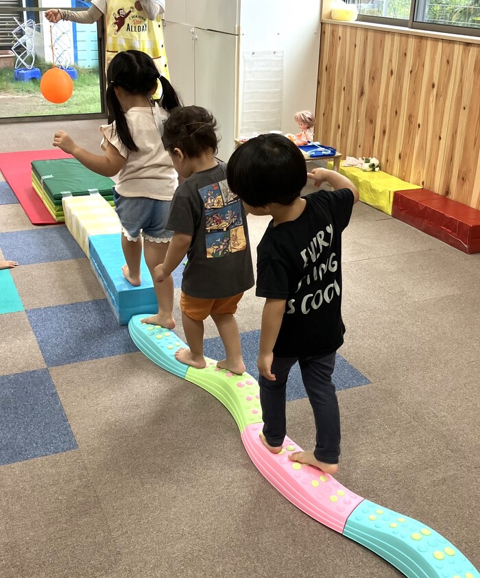 2024.10.4 平均台も上手になったよ! 2024年10月04日(金) 今日はあいにくの雨模様ですが、子どもたちはお部屋の中でも元気に遊んでいます ♪ 2歳のお友だちは平均台も上手にバランスをとり、すたすたと歩けるようになりました。 なちゅっこの平均台は波型になっていて、平行のものとは違い、よりバランス感覚を養うことが できるものを使用しています。 最後は風船に狙いを定めてジャンプ!! みんな「もう一回やる~ ♪」と何度も往復して、とっても楽しそうに体を動かしていました(*^-^*)