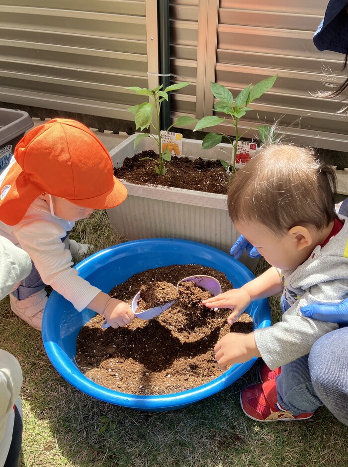 2025. 5. 7 夏野菜を植えました 2025年05月07日(水) みんなで夏野菜の苗を植えました。今年はキュウリ・オクラ・パプリカの3種類です。 子どもたちは”なんだろう”と初めは苗を見て少し不思議そうでしたが、一緒に土を入れたり、 じょうろで水をあげたりしてくれました。 みんなで収穫して食べる日が来るのが、今から楽しみです ♪