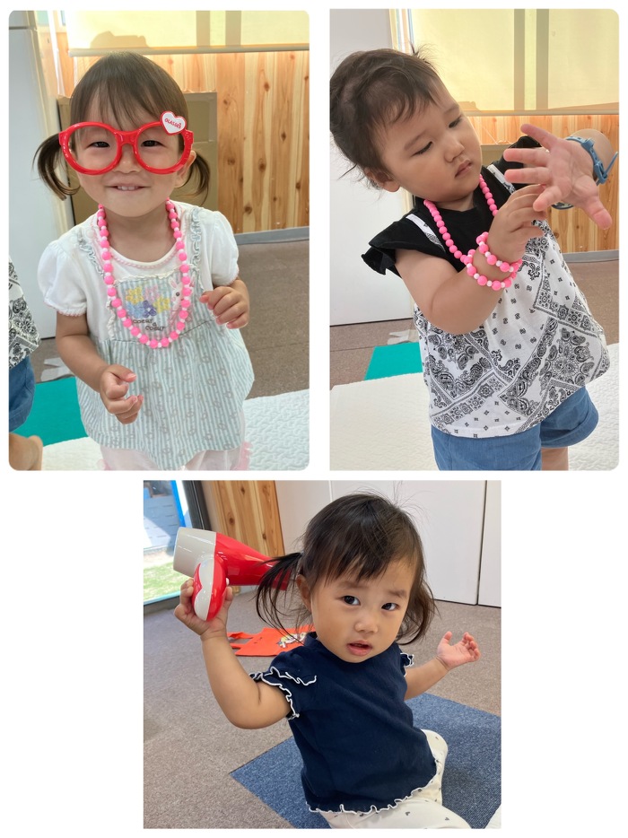 2025. 6. 5 メイクごっこ 2025年06月05日(木) ドライヤーで髪を乾かしたり、お友だちや先生にメイクをして 遊びました。 メガネをかけると、先生に「見てー!」と言って 見せにきてくれる姿がとても可愛いです。