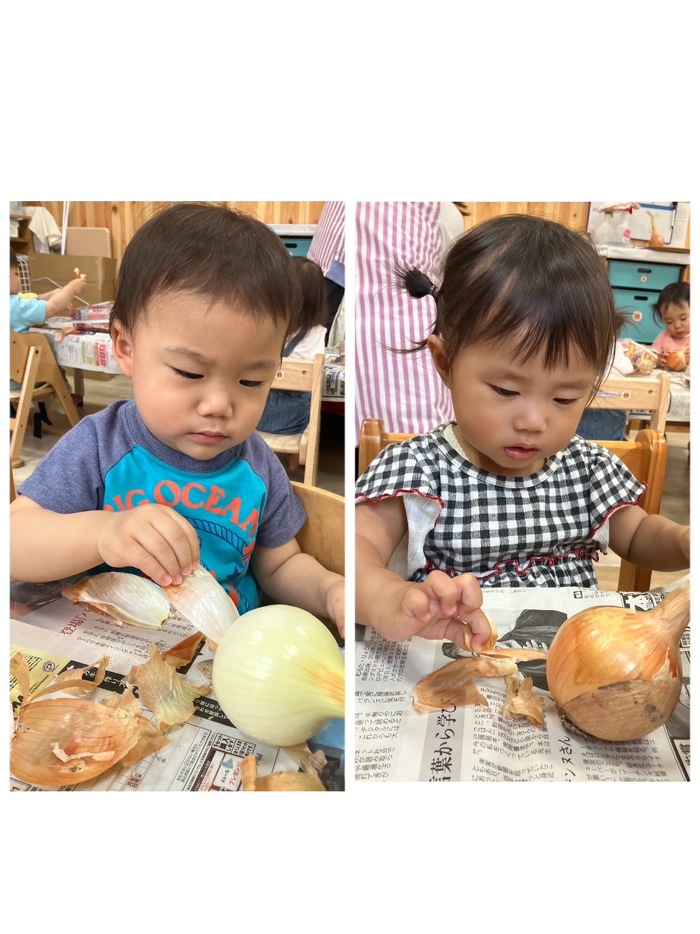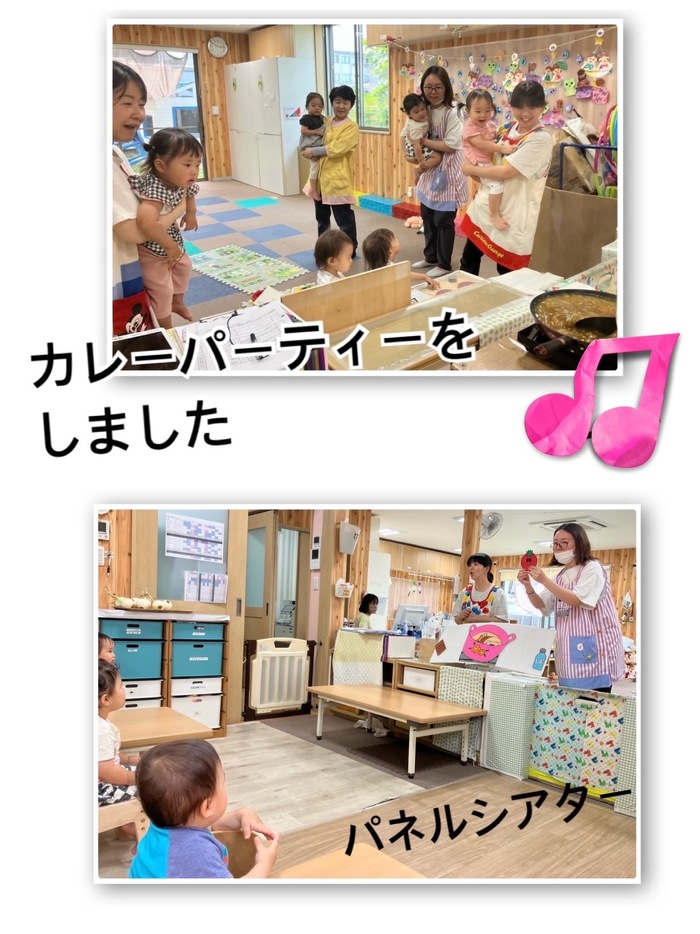 2025. 6. 19 ☆カレーパーティーをしました☆ 2025年06月19日(木) 園の畑で育てたタマネギを使って、カレーパーティーをしました。 園児は一人一つタマネギの皮をむきました。かわいい指で摘んでむいてくれました。 その後は調理スタッフが野菜を切ったり、炒めたりする様子を見ました。 カレールーを入れたらいい匂いがしてきたね! 先生たちのパネルシアターも喜んで見てくれましたよ。 みんなで作ったカレー、おいしかったね ♪
