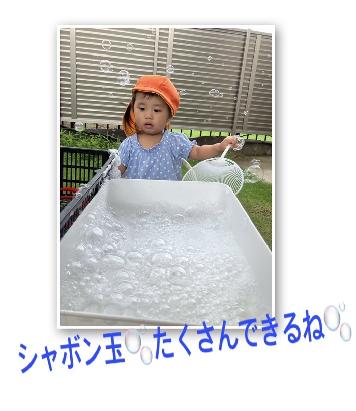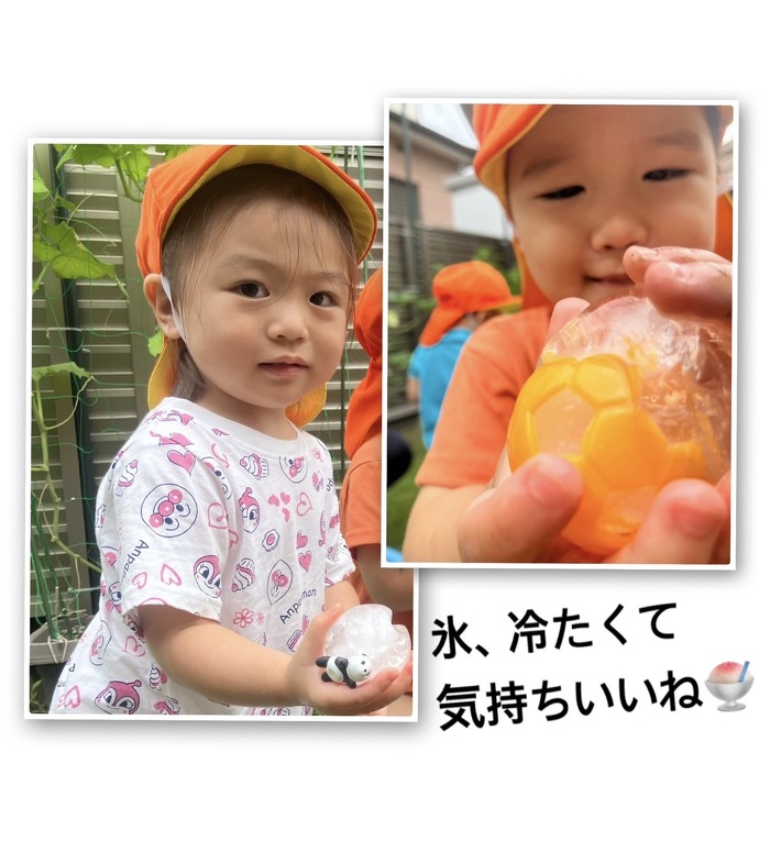 2025. 7. 21 氷冷たくて気持ちいいね♡ 2025年07月21日(月) 暑い夏に戻り、水遊び再開です。 お水の中に何と、かわいい氷が仲間入りです。 かわいくて冷たいから、、こどもたちも興味津々! シャボン玉遊びも大好き。ふわふわ泡あわ、楽しいね ♪