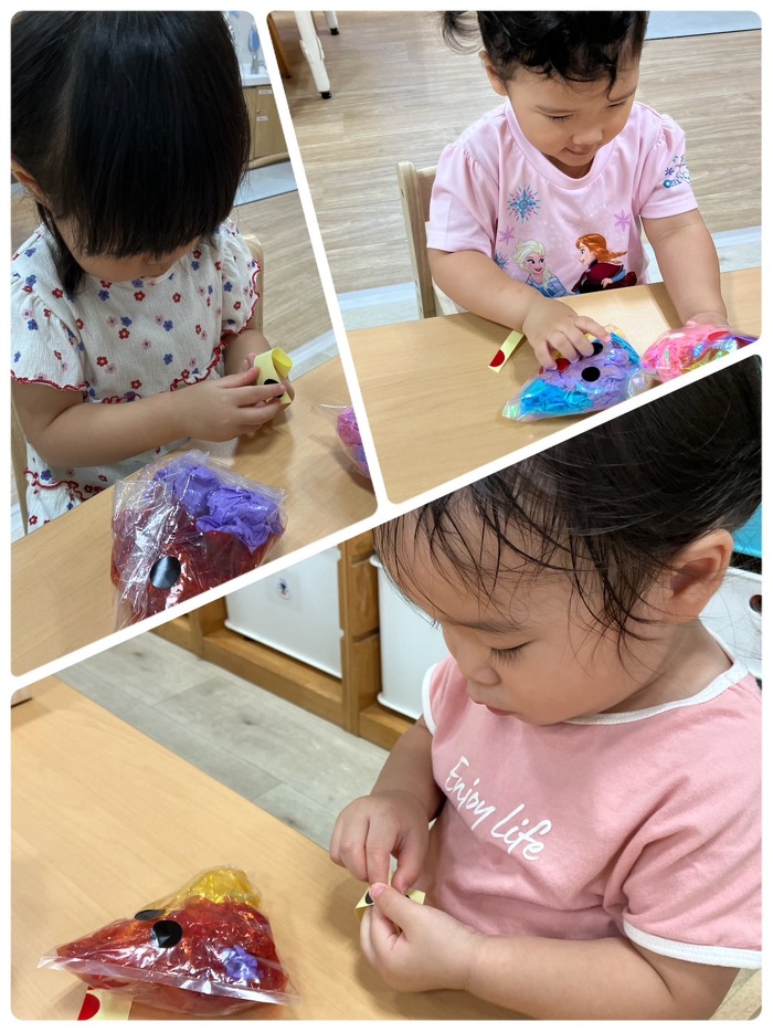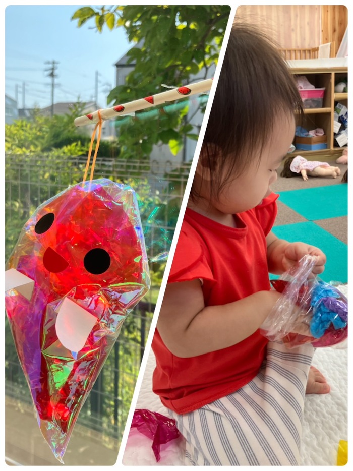 2025. 8. 20 おばけ作り 2025年08月20日(水) 「おばけなんてないさ」の歌をうたったり、おばけになりきったり、おばけブームのなちゅっこの子どもたちです。 そこで、みんなで袋の中にカラーセロファンやお花紙をつめて、シールで顔もつけて、かわいいおばけを作りました。 「おばけがいるー!!」と大盛り上がりです!!
