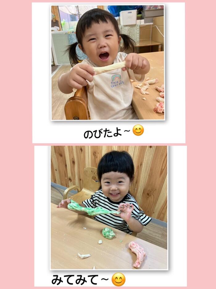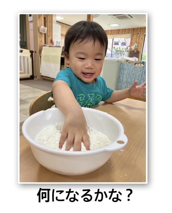 2025. 8. 23 何になるかな? 2025年08月23日(土) 何になるのかな?答えは小麦粉粘土でした! 保育者と一緒に混ぜて混ぜて混ぜて、こねこねしてできました。 パンや好きなキャラクターをイメージして遊ぶ姿がかわいらしかったです ♡