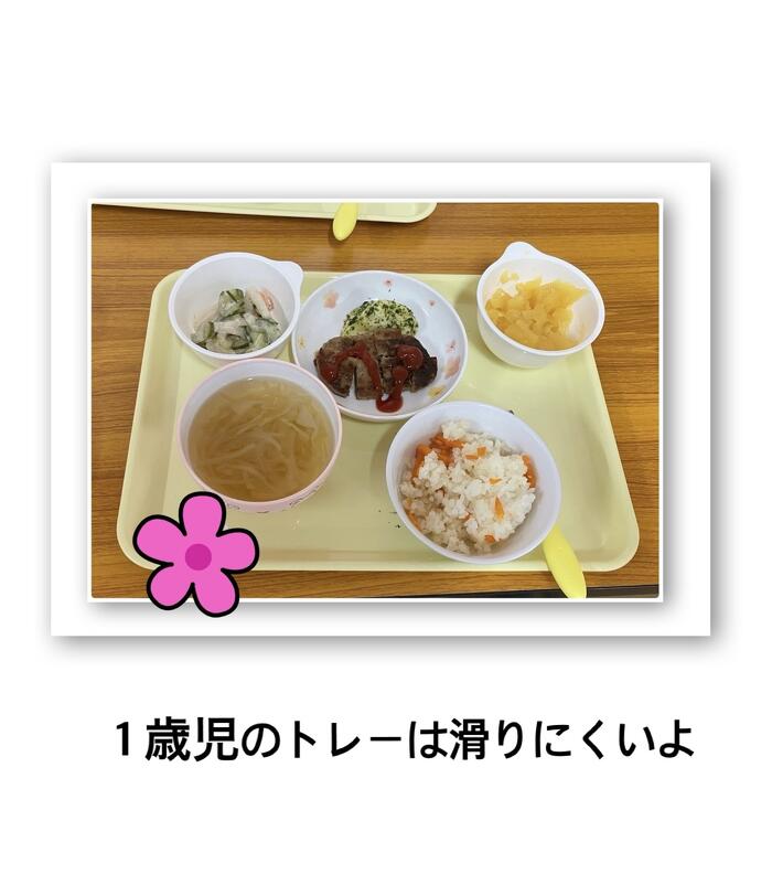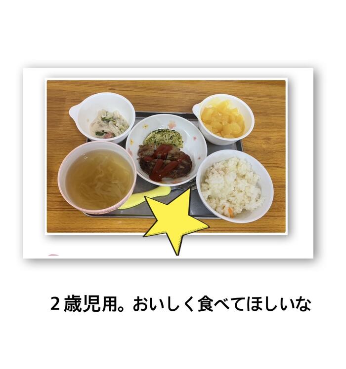 2025. 9.8 給食いいにおい♡ 2025年09月08日(月) 当園の給食は、業者さんが毎日材料を配達をしてくれて、スタッフが毎日朝から調理をしています。 遊んでる途中で料理のにおいがすると「いいにおい~♡」「今日は何かなぁ?」と、早く食べたくなる子どもたち。 この日のメニューは、キャロットピラフ・ハンバーグ・3色サラダ・スープ(玉ねぎ、キャベツ)・オレンジゼリーです♪