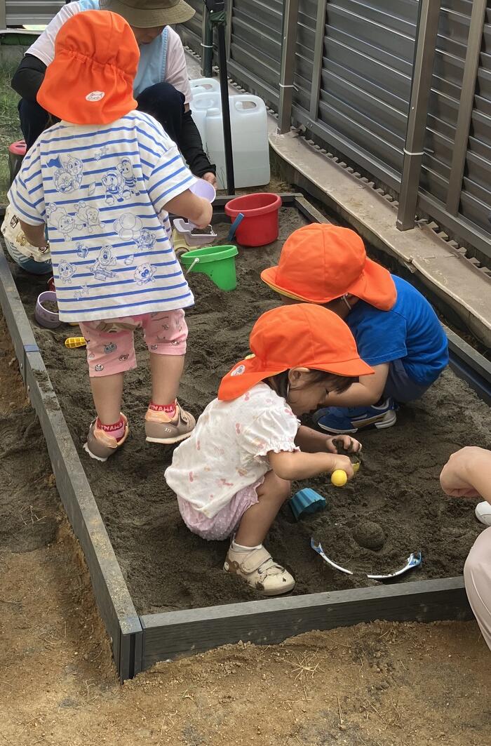 2025. 9 .29 砂場遊び楽しいね! 2025年09月29日(月) 長く続いた猛暑がやっと過ぎ去り、戸外での遊びを楽しめる日々になりました。 楽しく安全に遊べるよう、園庭の砂場の環境を整え、戸外に出る気持ち良さと 開放感を感じながら子どもたちは夢中になって遊んでいます。