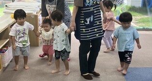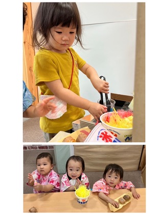 今日は夏祭りごっこ☆ たこ焼き屋さん・かき氷屋さん・お面屋さんにわなげのコーナーを作り、おもちゃの お金を握りしめて、それぞれが好きな所へ行って楽しみました。 みんなお祭りは慣れたもので、ちゃんとお金と商品のやりとりができ、食べるまねを したりお友だちとお喋りしながらとても楽しそうでした。 1歳の子ど...