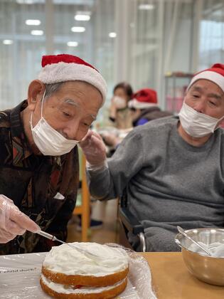 先日、クリスマス会にてケーキ作りや景品付きのゲームをしました。生クリームの塗り方からフルーツをどこに乗せるかなど、近くの方とおしゃべりしながら一生懸命作られました。もちろん味はバッチリです。 最後はサンタさんからのプレゼントと写真撮影がありました。