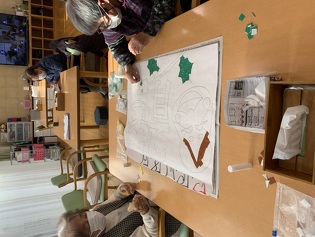 来月のカレンダー作りが始まりました。 この絵は、何?と話されたり利用者様どうし話されながら取り組まれている姿が見られています。 細かいところまできれいに貼り絵をされています。 どんな風に出来るか楽しみです。
