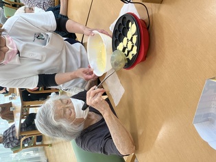利用者さんと一緒におやつレクでカステラボール作りを行いました。 皆さん、たこ焼き器に液を半分いれて丸くしてくださっています。 なかなか、上手いこと丸くなりませんでしたが、皆さん出来上がるとおいしく召し上がれている様子でした。