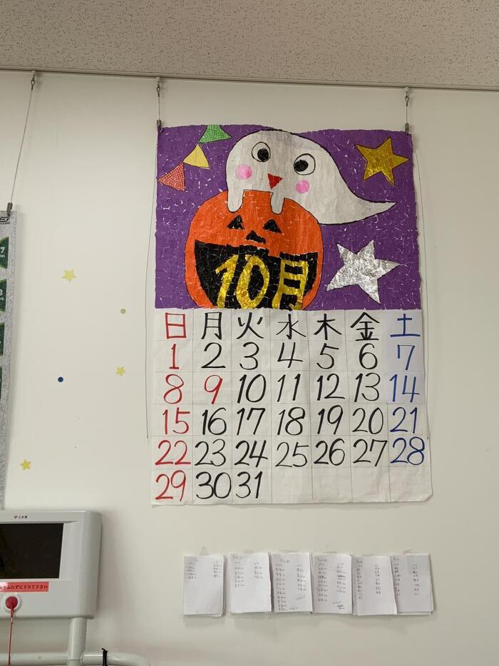 今月の貼り絵カレンダーのご紹介です。 2023年10月10日(火) 今月はハロウィンです。今月は珍しく洋風の行事の絵になりました。 都会では若い方が仮装して盛り上がっていますが、このあたりだと子供たちが仮装をして お菓子をもらいにくることがあるみたいです。