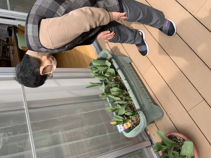 春のおとずれ 2024年03月26日(火) デイで育てているチュ-リップが、写真を撮った際は蕾でしたがつい先日開花しました。 チュ-リップと言えば5月だと思っていたのですが、少しあたたくなって早く開花したと思います。 赤い花でとても綺麗です。 最近は、寒暖差が激しいですが体調には気を付けてお過ごしください。