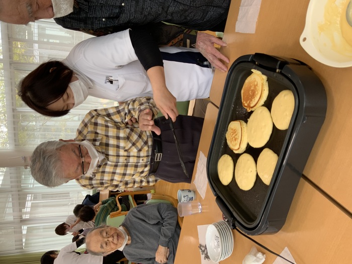 おやつレクを行いました。 2024年04月02日(火) 久しぶりにおやつレクでホットケーキ作りを行いました。 皆さんきれいに焼かれてひっくり返して下さました。 ホットケーキにバタ-やあずきをつけたりして皆さん美味しそうに召し上がれていました。 また、近いうちに行いたいと思います。