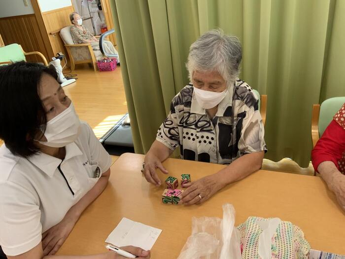 お昼ごはん後の風景です。 2023年08月29日(火) お腹がいっぱいになったところで、少し時間があるので木のパズルをしているところです。 動物の絵やおめでたい漢字のパズルです。これらはみんなスタッフの愛情がこもった手作りです。 組み合わせによっては、変な絵や文字になるので笑いが起こります。 すきま時間にもいかに楽しく過ごしていただくか、日々考え中です。