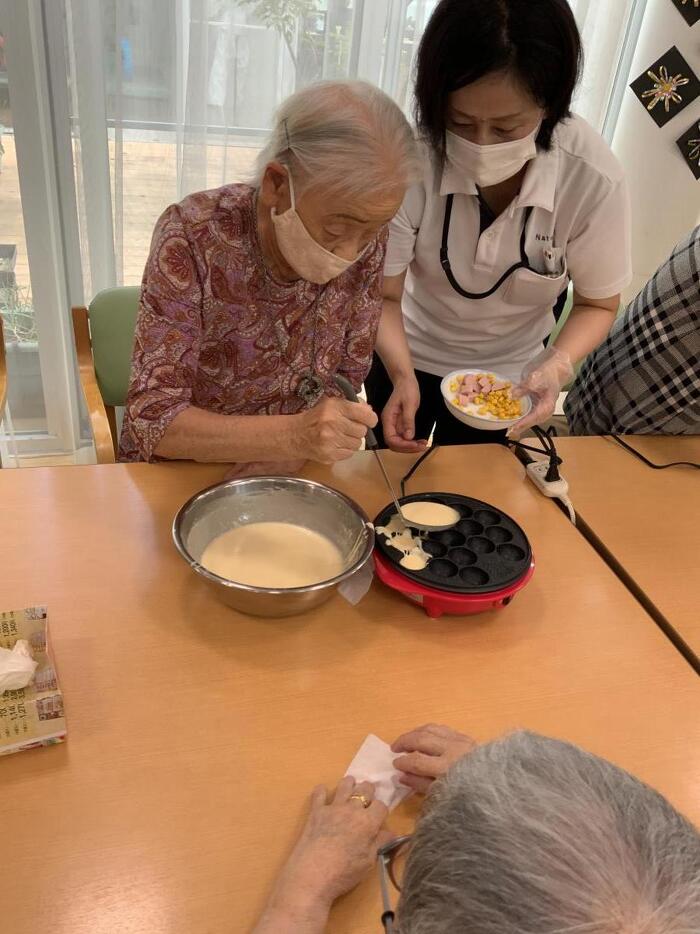 またまた料理のレクリエーションをしました。 2023年08月22日(火) またまた料理のレクリエーションをしました。 今回はホットケーキの生地にコーンやソーセージを入れて、たこ焼き器で焼きました。 生地を入れたり、竹串でクルクル回すのも利用者さまにやっていただきました。 特に女性陣は慣れた手つきでやってみえました。 またやっていきます。 みなさんの楽しそうな雰囲気がとてもよかったです♪