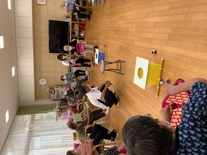 レクリエーションの様子 2024年06月04日(火) レクリエーションのゲームの様子です。 板の上にお手玉を乗せるゲーム。 なかなか、思い通りにいかず〇の中に入ってしまいなかなか得点がとれない事もありましたが、皆さん楽しく参加されている様子でした。