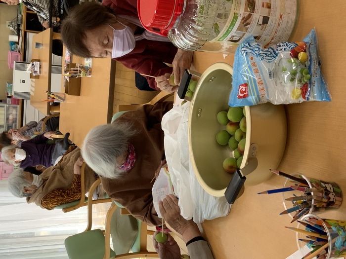 梅のヘタを利用者さんが苦戦しながら取られている様子です。