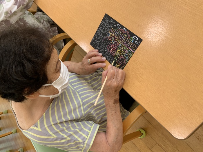 スクラッチアート 2024年07月16日(火) スクラッチアートのシートを利用者様が集中して銀の部分を削られています。 普段、何もやりたくないと言われる利用者様でも熱心に取り組まれている姿が見られています。 浮かび上がったアートが綺麗です。