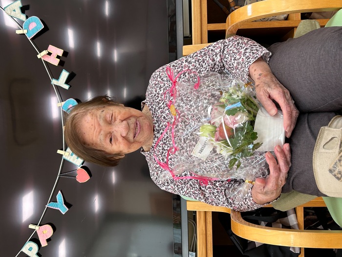 お誕生日会 2024年10月10日(木) 今月、お誕生日を迎えられたなちゅらるで最高齢の方です。 いつも、お元気で歩けないと言いながら、歩かれています。 他の利用者さんや職員に笑顔で声をかけてくださいます。 いつまでも、お元気でいてください。
