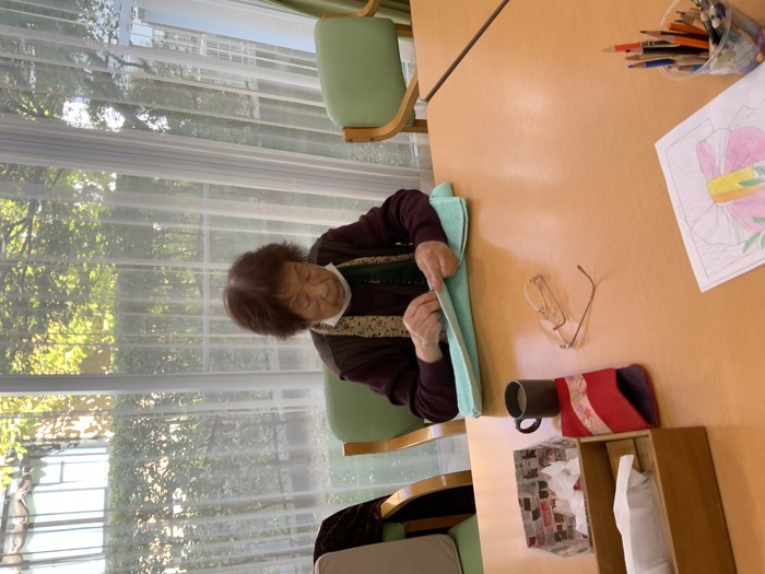 足マット作り 2024年11月19日(火) 手の器用な利用者様が足マットのタオルを綺麗に縫ってくれました。 よく、お裁縫をされていたとの事で集中して丁寧に縫われています。 手の器用な方がいて助かっています。