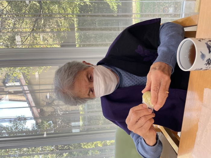 おやつレクで、芋茶巾作りをしました。さつま芋に甘納豆をいれた茶巾です。