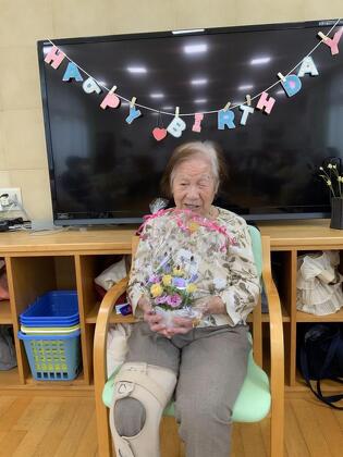 お誕生月に、お花のプレゼントや歌や写真のプレゼントをお渡ししています。 今回、こちらの利用者さまはなんと、98歳です。おめでたいことですね。 長いことデイに通っていただいて、本当に感謝しています。 これからもお元気な姿を見せてください(^^)/