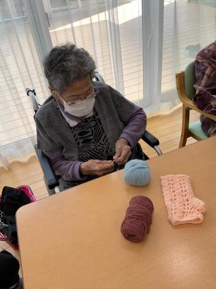 今回は指が出るタイプの手袋です。 あっという間にここまで作られました。さすがですね。 編み物のほかにも針仕事をやっていただくこともあるんですよ。 デイで使う布巾も縫ってくださりと、とても助かっています。