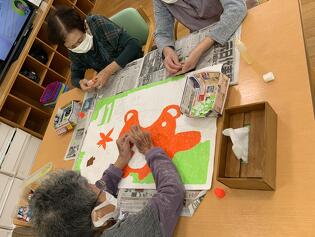 来月の貼り絵製作のご様子です。 毎月製作していますが、同じ利用者さまに作っていただいているわけではなく、男女問わずいろいろな方にやっていただいています。 さあ、来月はなんの絵でしょうか?