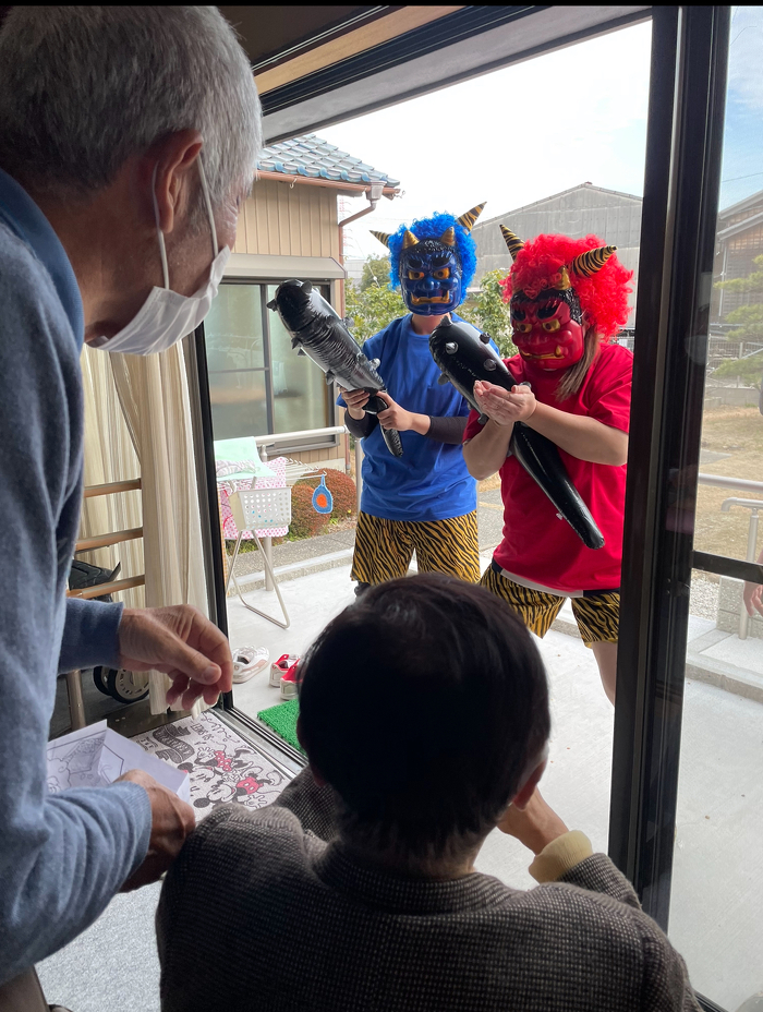 節分と言えば豆まき!!利用者さんと一緒に「鬼は外!!」と大きな声で鬼退治できました!!