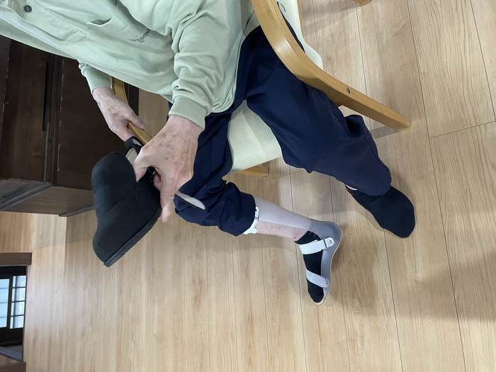 機能訓練 2024年06月23日(日) 利用者さんが靴を自分で履くのが難しく家族が介助されています。そんな利用者さんの靴を履く練習を機能訓練で行っています。最初は難しい状況でしたが、今では少しづつ履けるようになっています。あと一歩!!一緒に頑張っていきます。