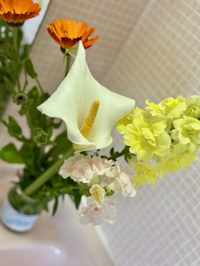 ご利用者さんが自宅で咲いた花を持ってきて下さいました! カラーがとても素敵ですね♡ 春はたくさんの花が咲いているので気持ちが明るくなりますね!