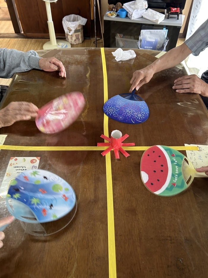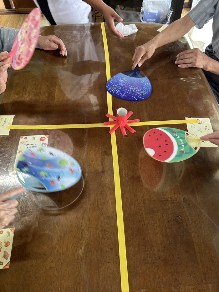 レクリエーションでタコ退散を行いました。うちわで仰ぎ最後にタコがいるスペースの人が負けになるゲームです!!