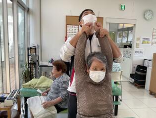 元気にリハビリに取り組まれています 寒くて縮こまりがちな上肢をしっかりストレッチしていきます パンチをしている訳ではありませんよ