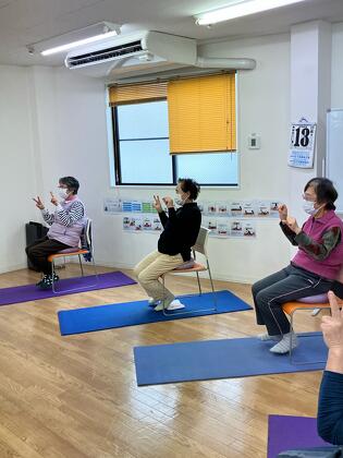 ディスクに座って両足を上げバランスを保ちながら指の体操をしました。 バランスを取るだけでも大変ですがそこに指の体操が入るので脳トレにもなります。 皆さん苦戦しながらも頑張られていました。