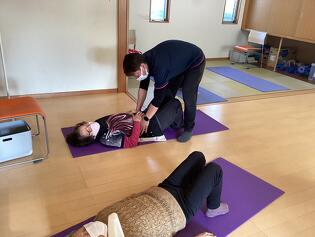写真は腹式呼吸の様子です。きちんとお腹に空気が入っているか先生がチェックしています。 リラックス効果や血行改善など様々な良い効果があります。マスターしてお家でも是非やって頂きたいです。