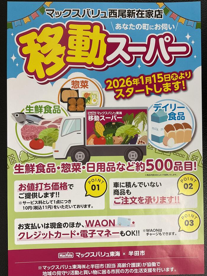 移動スーパーが来ました 2026年01月15日(木) 1/15から毎週木曜日に移動スーパーがなちゅらる鍼灸接骨院の駐車場に来る事になりました。 初回は利用者さんや近くの地域の方が沢山来てくれました。 お惣菜や果物、調味料なども売っていました。 車を運転できない方やスーパーまで遠い方には便利だと思います。 14:53〜15:10頃駐車場に来ますので是非利用してみて下さい。