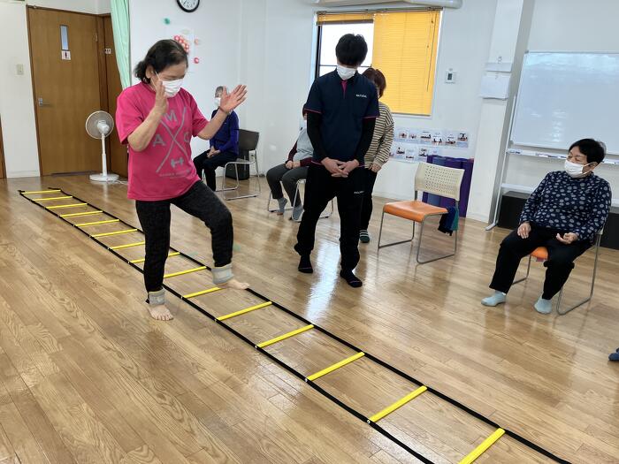 ラダーでの歩行トレーニングです。3の倍数で手を叩いて脳トレも行なっていきます。運動しながらの脳トレは記憶力、認知機能の維持・向上に効果的です。
