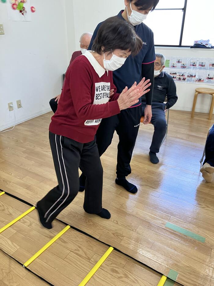 脳トレしながらラダートレーニングのコピー 2026年03月12日(木) ラダーで歩行しながら同時に3の倍数と3が付く数字の時に手を叩くというお題でトレーニングをしました。 みなさん苦戦しながらも頭を使い楽しくトレーニングされていました。