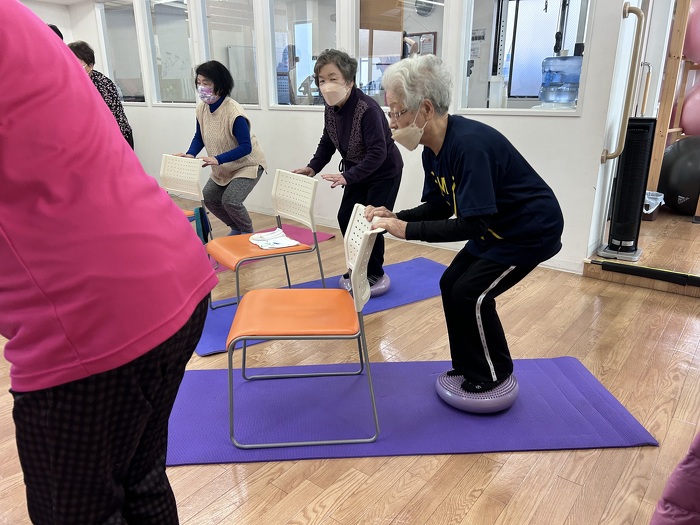 スクワット上級 2023年12月15日(金) スクワットは下肢の筋トレには欠かせないトレーニングメニュー。 今回はバランスディスクの上で行ってもらいました。 ディスクの上で行うことで下肢のトレーニングに加えて体幹も鍛えることができます。