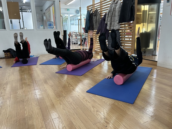 ポールに乗ってバランス 2023年12月23日(土) 分かりにくいかもしれませんが、ストレッチポールという円柱状の物の上に寝てます。 ストレッチポールなのでストレッチを行うのが本来の目的ですが、体幹トレーニングも行えます。 画像の方達はポールに寝てもらい、右手以外を床から離しています。 結構なトレーニングです。 運動を継続する事によって、この様な事も出来るようになります。