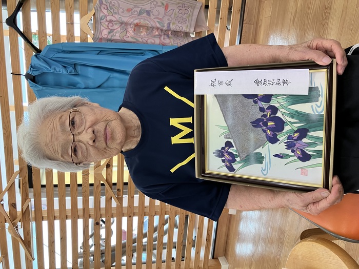 愛知県知事さんからの記念品 2024年09月27日(金) 先週と同じ方です。 100歳のお祝いで愛知県知事さんから記念品を頂いたみたいで、見せてくれました。 愛知県の伝統工芸である名古屋友禅で作られた県花のかきつばたです。 見せてもらった他の利用者さんは、私ももらうぞと張り切っていました。
