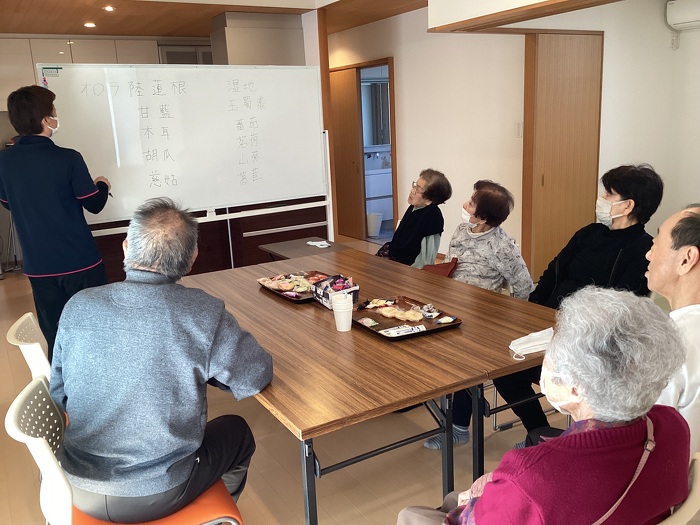 漢字問題 2025年04月17日(木) 今回も常盤町での様子です。 体操後に脳トレで漢字の問題をみんなで行っています。 難しくて分からない漢字ばかりですが、ある方は分かる漢字がいくつかあり、他の利用者さんから尊敬の眼差しでした。